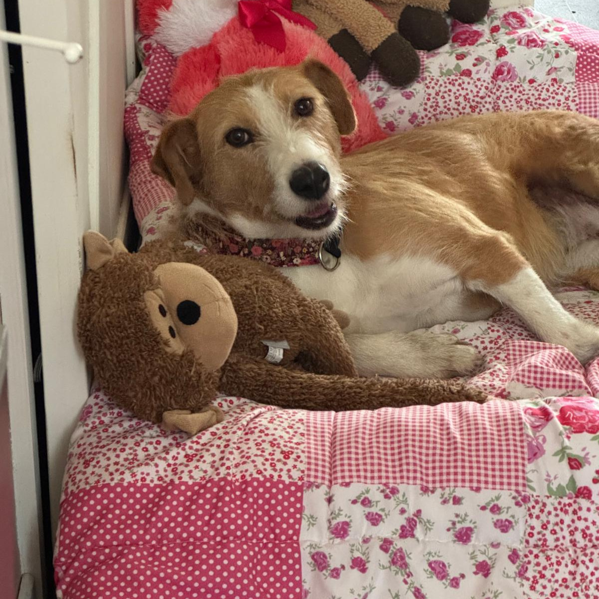 Shirley is een echte knuffelkont: aanhankelijk, sociaal en altijd op zoek naar contact met haar mensen. Ze kijkt je met zo’n zachte, wijze blik aan dat je direct smelt. Ze houdt van aandacht en speelt graag, zowel met mensen als met andere honden. Ook met katten gaat ze goed samen. Ze is voorzichtig en vriendelijk met (klein)kinderen en geniet zichtbaar van gezelligheid om haar heen.